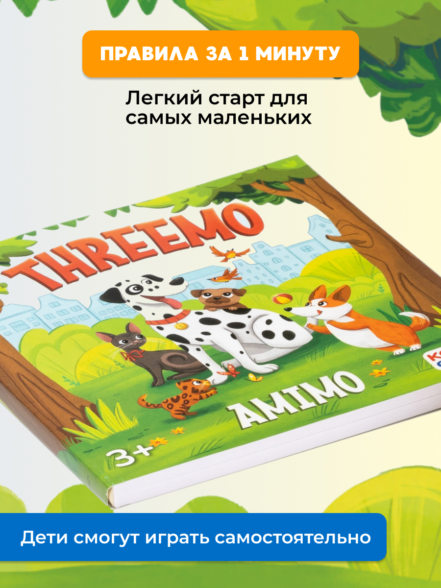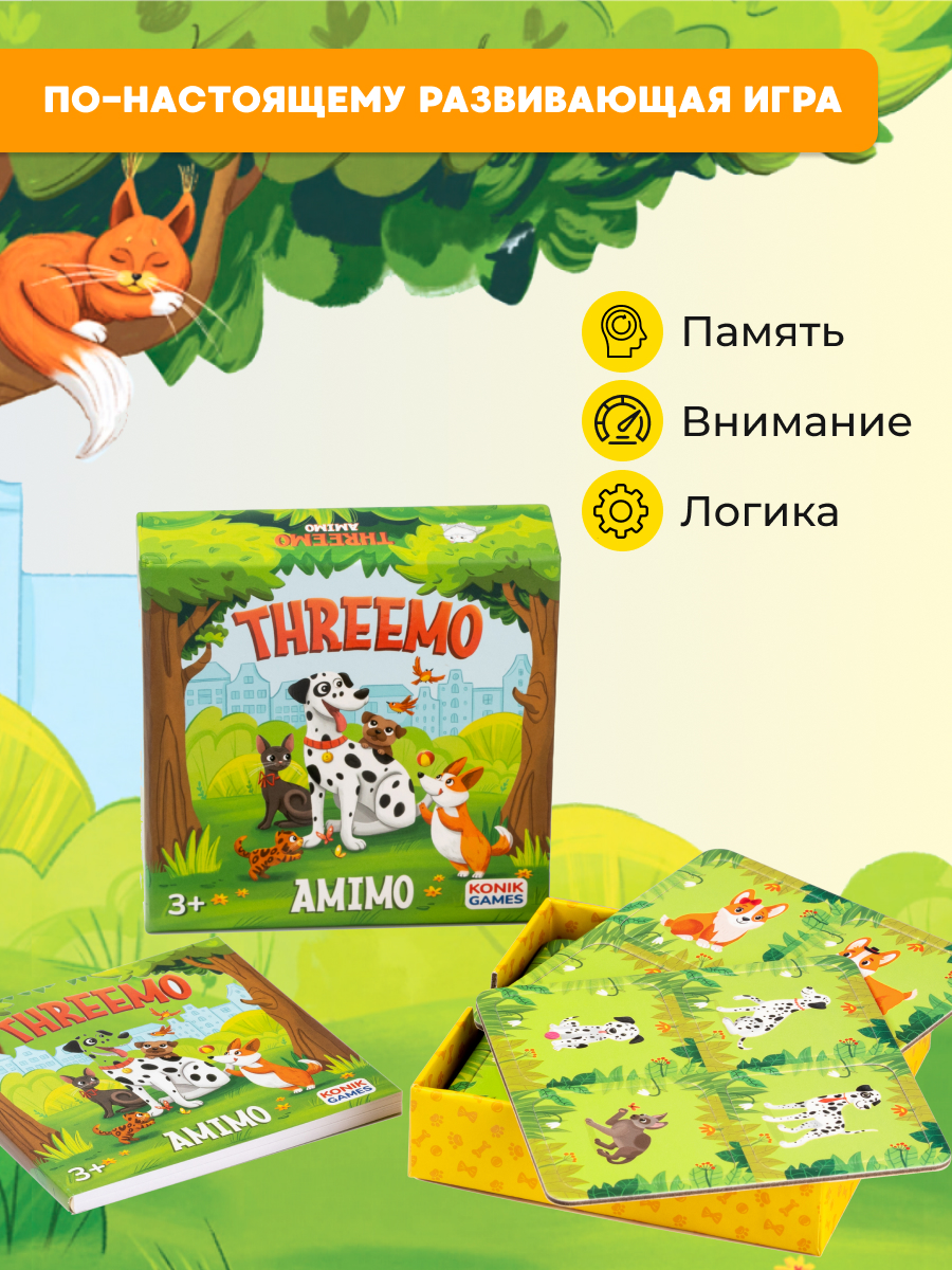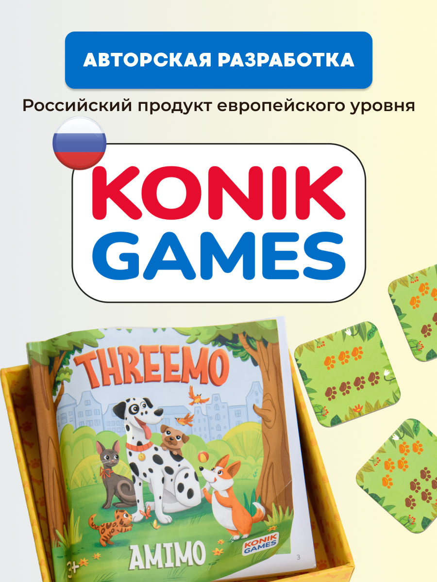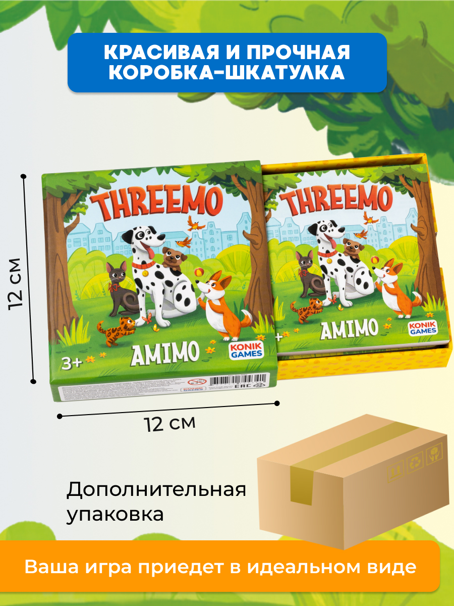 THREEMO AMIMO от KONIK GAMES — это оригинальная вариация мемо для всей семьи. В ней нет ни одной одинаковой карточки! Зато есть 4 уровня сложности — каждый участник сможет подобрать для себя подходящий.