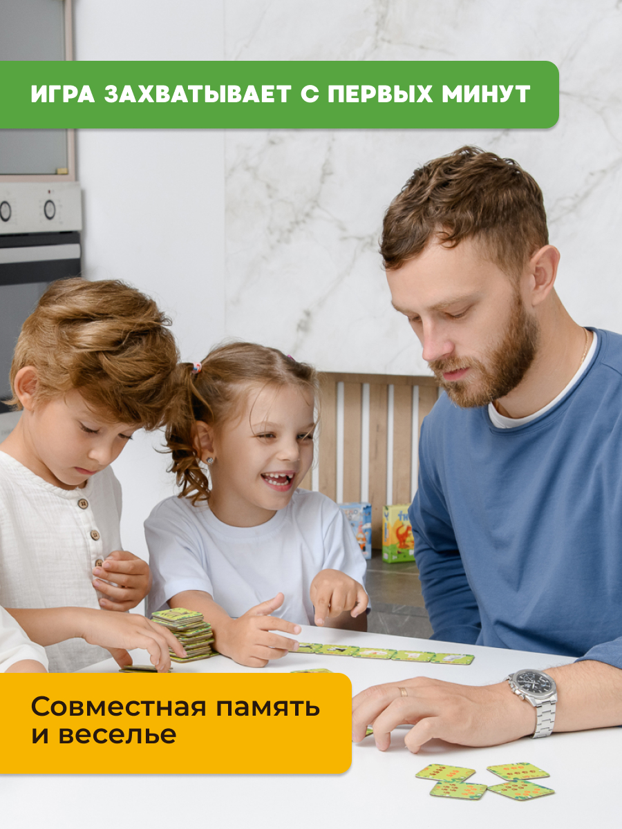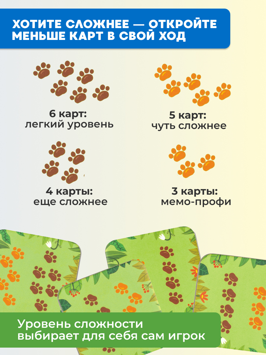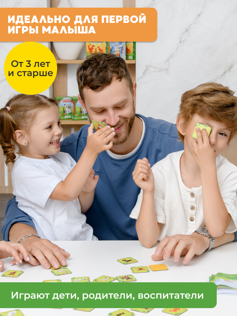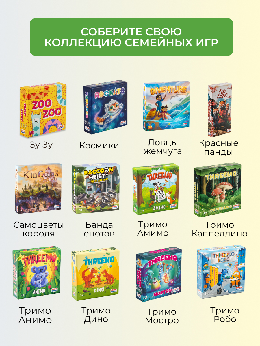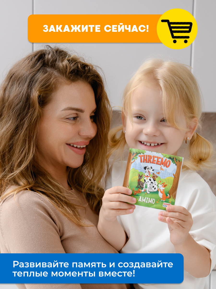 THREEMO AMIMO от KONIK GAMES — это оригинальная вариация мемо для всей семьи. В ней нет ни одной одинаковой карточки! Зато есть 4 уровня сложности — каждый участник сможет подобрать для себя подходящий.
