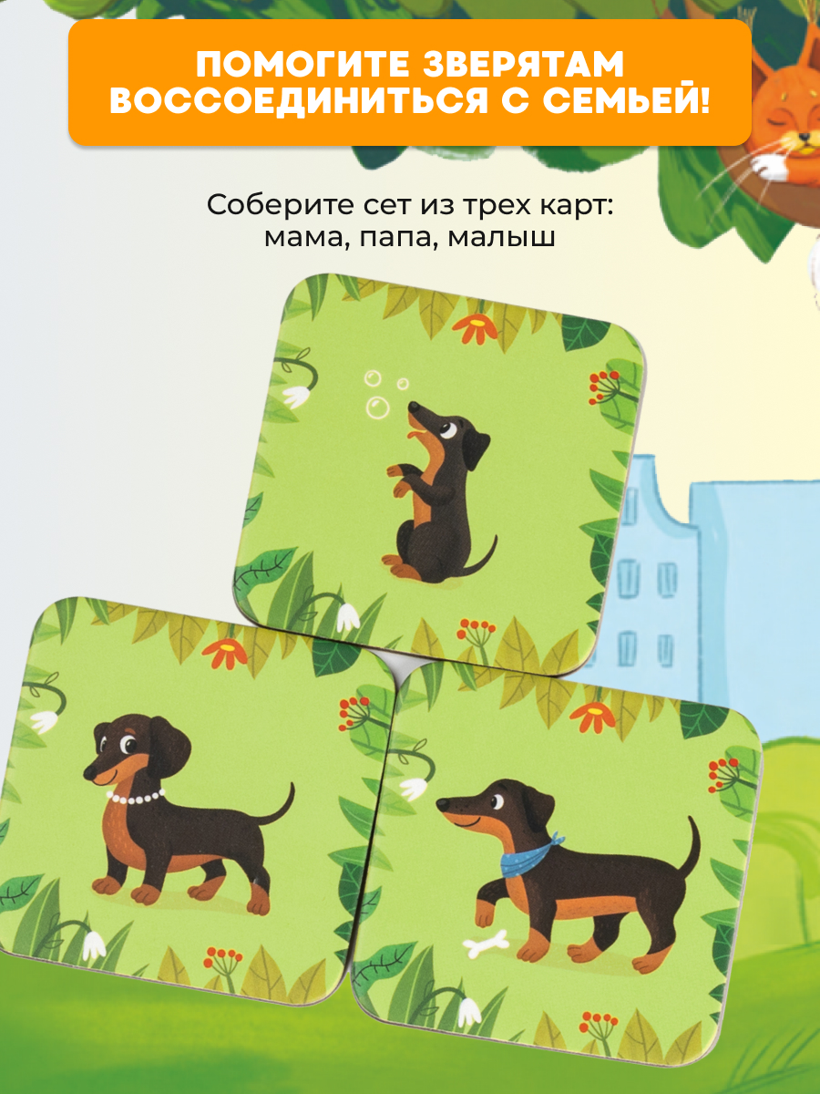В этой веселой настольной игре вам предстоит собрать как можно больше сетов «мама, папа и малыш» из семейств милых котиков и собачек. В свой ход игроки могут открывать от 3 до 6 карточек. Это позволяет одновременно играть и детям, и родителям – в полную силу и с шансами на победу!