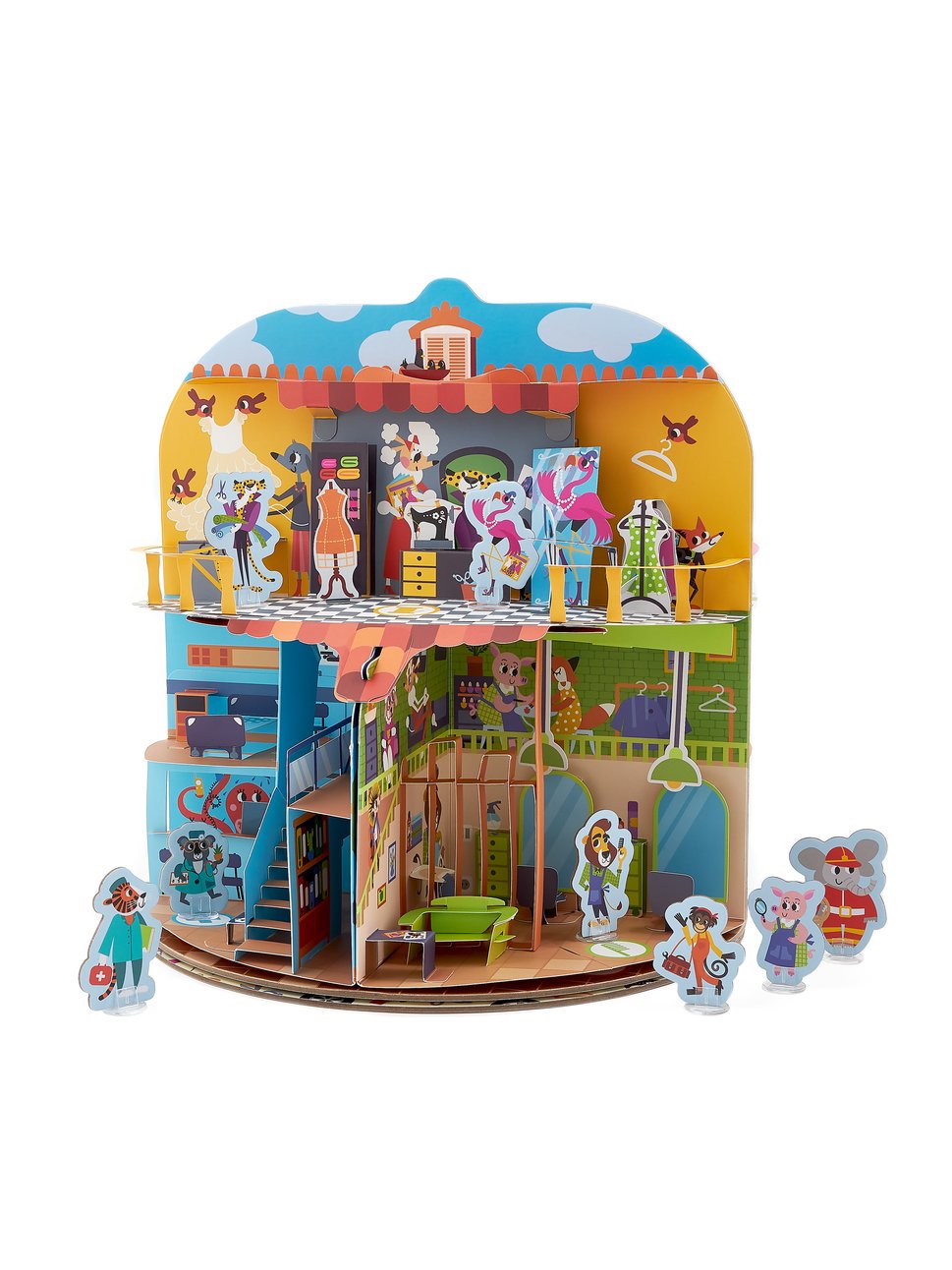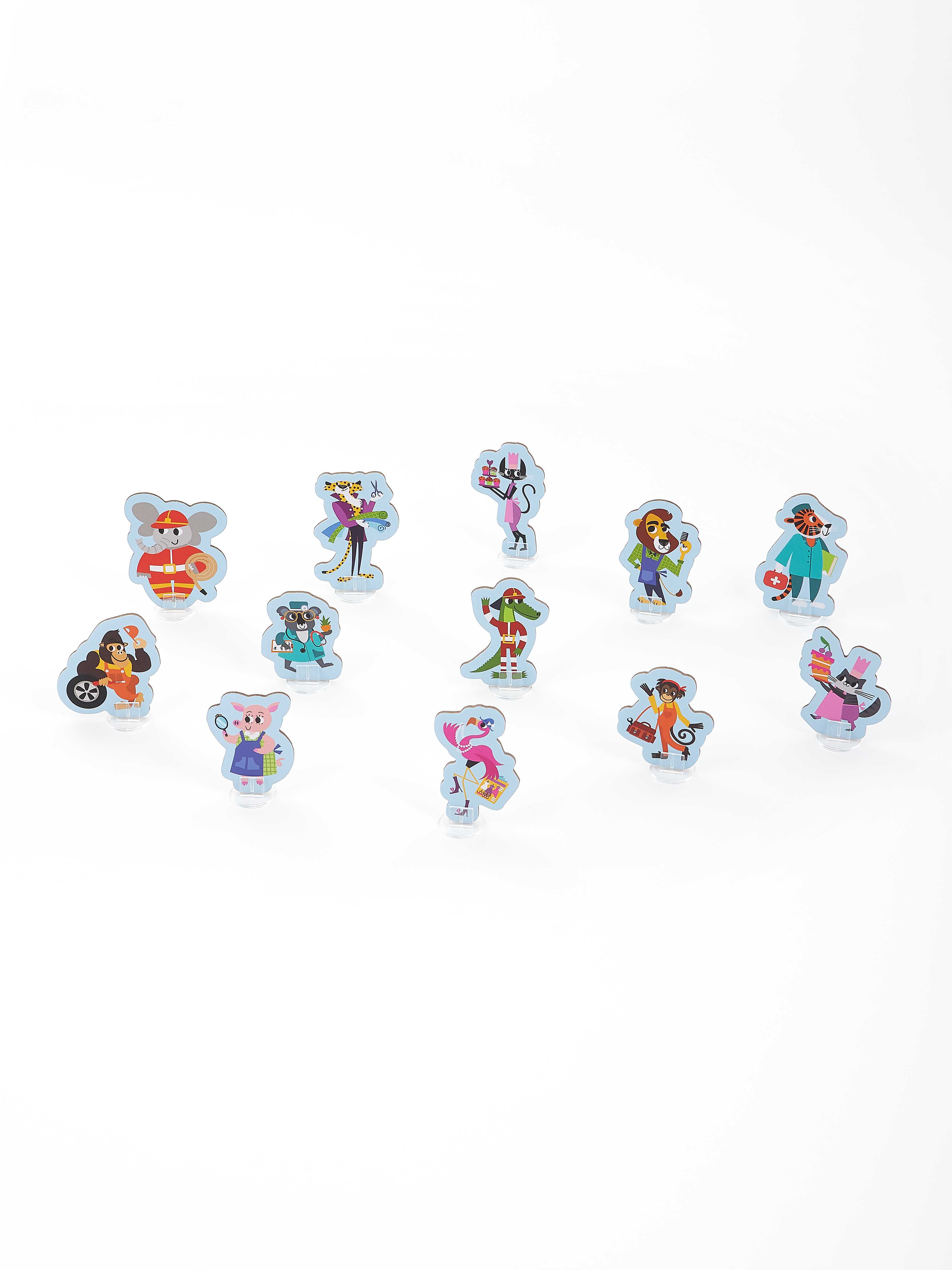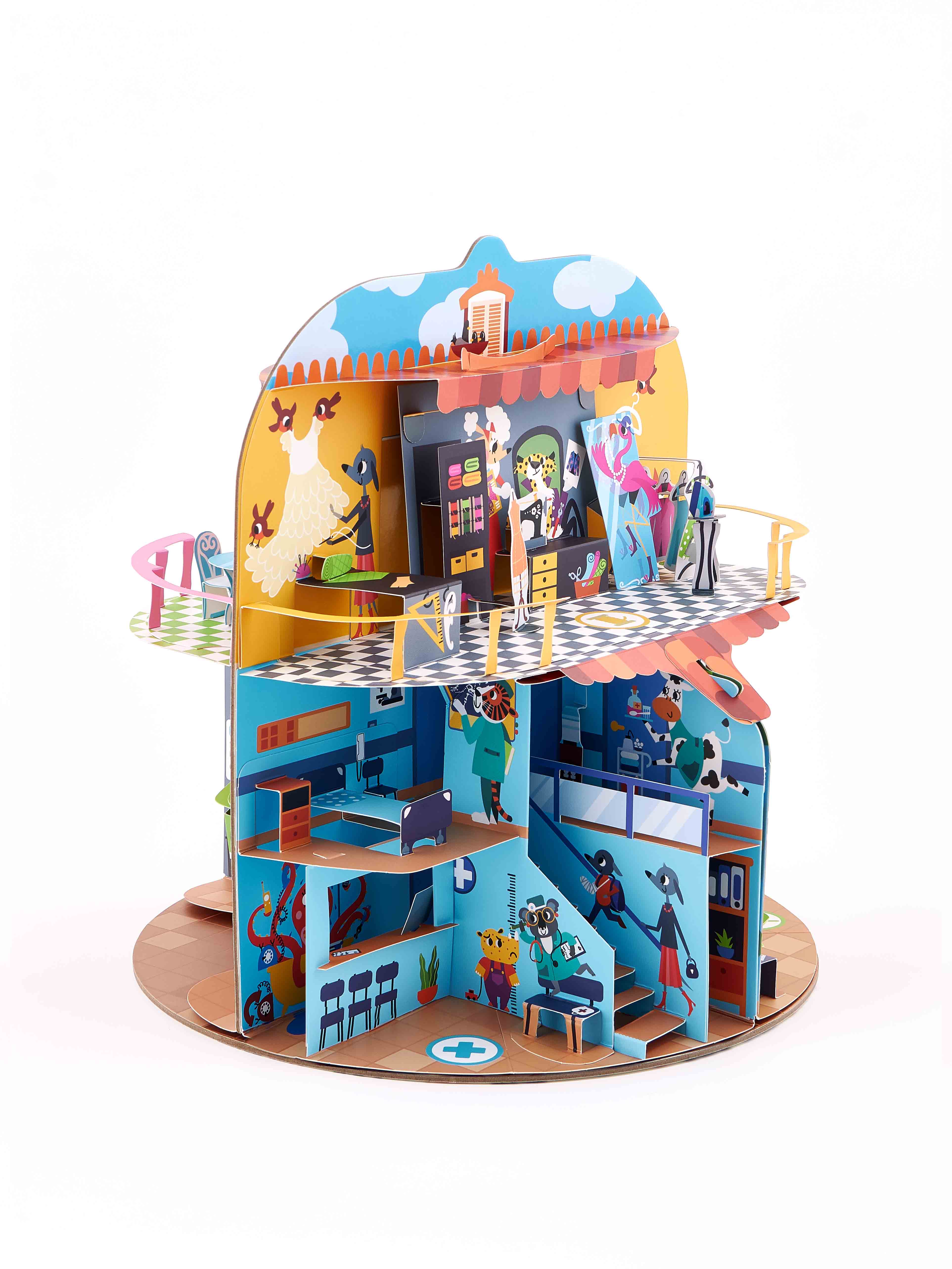 Большой pop-up домик с 6 секциями: кондитерская, салон красоты, больница, пожарная станция, ателье, автомастерская; 72 карточки профессий, кубик, 50 монеток, 12 фигурок на подставках, правила.