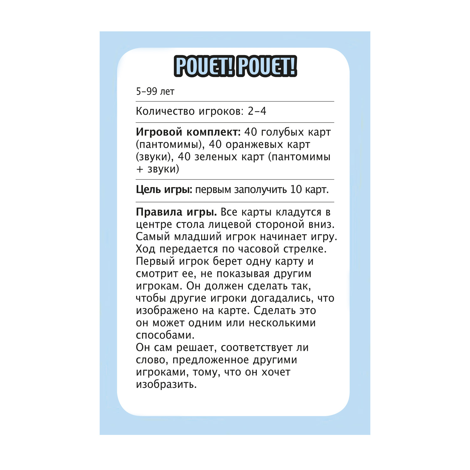 Детишки не могут успокоиться? Пришло время для игры в пантомиму, где каждый может выразить себя забавными способами! Имея 120 разных карточек, дети должны ждать своей очереди, чтобы угадать, что изображено на карточке, используя звук или пантомиму, или и то, и другое. Смех гарантирован!