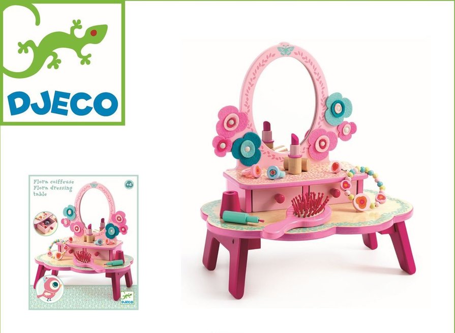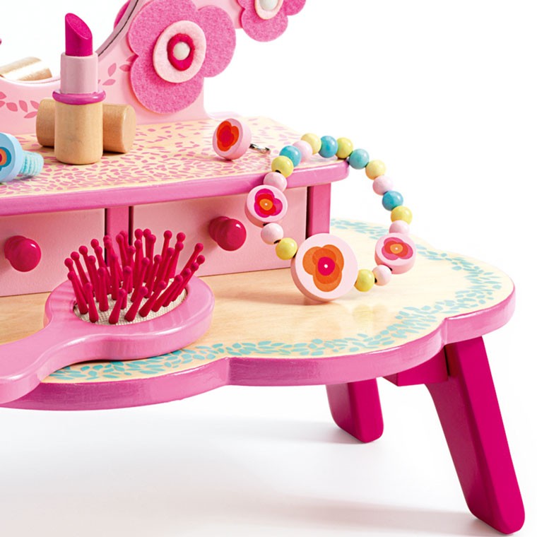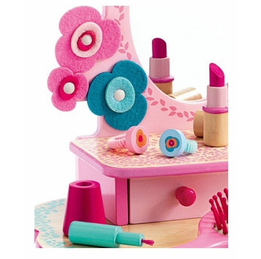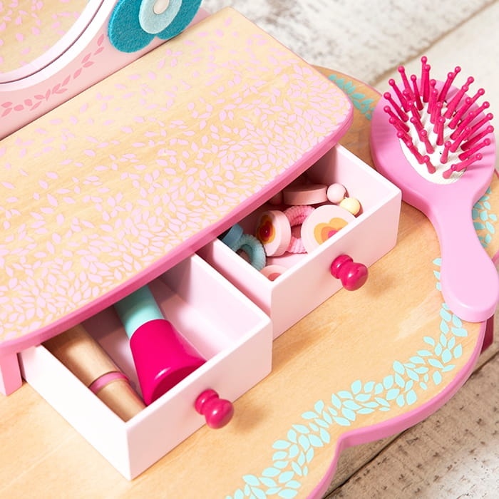 Туалетный столик Flora — очаровательный деревянный туалетный столик с большим зеркалом, чтобы маленькие девочки могли весело провести время, делая прически и макияж! Имеет два ящика для хранения украшений и множество косметических принадлежностей.