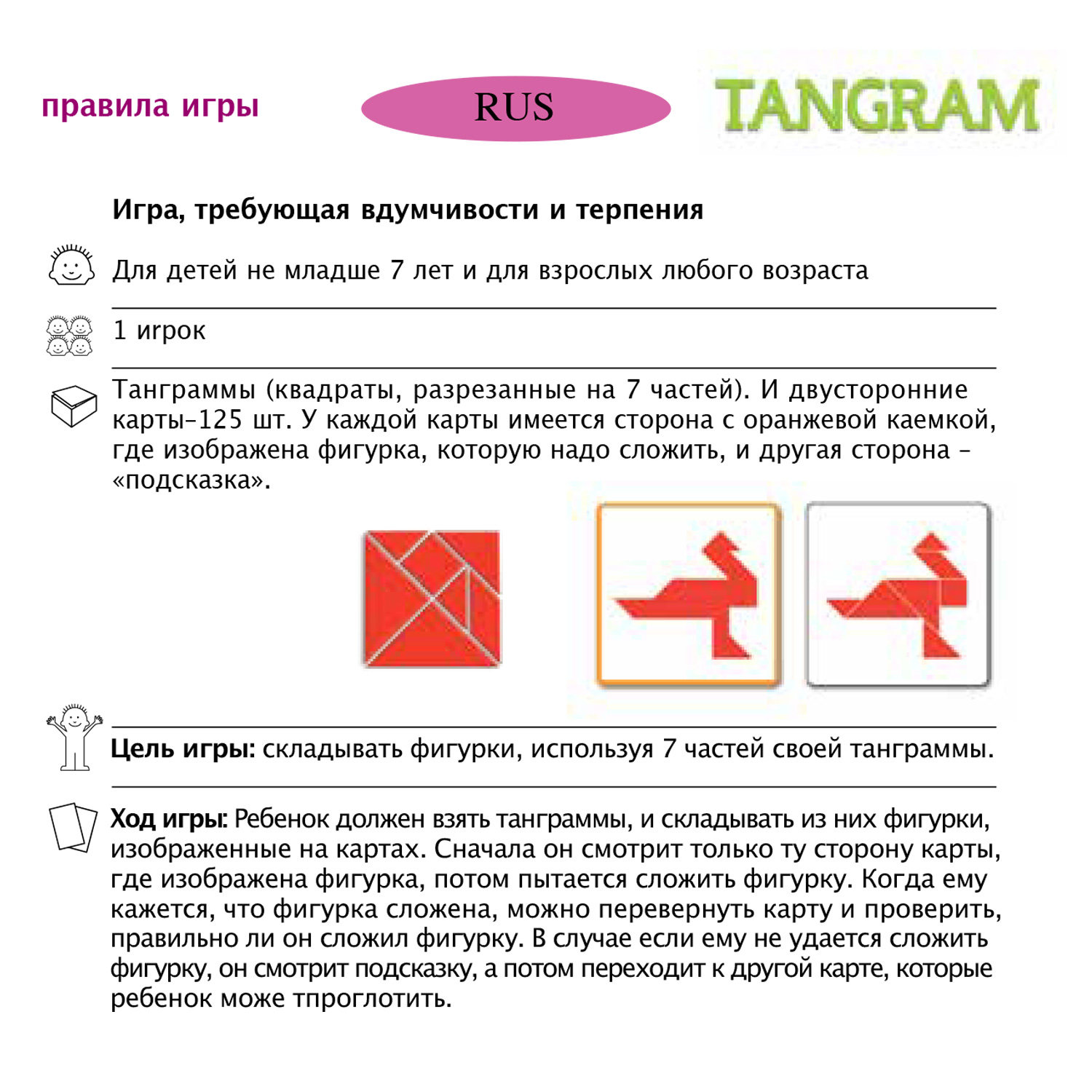 5 треугольников, 1 ромб и 1 квадрат достаточны для создания 125 различных персонажей. Кто сможет собрать их обратно ?! Игра-головоломка, в которой игрок должен воссоздать персонажей, используя 7 фигур на их танграме.